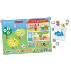 Un jeu de logique sur la thématique de la ferme. 2 modes de jeu. Un mode de jeu individuel où l’enfant suit les règles pour placer les différentes pièces et relever le défi indiqué sur chaque carte. Un mode de jeu compétitif où le gagnant est le premier joueur qui obtient les 5 cartes.