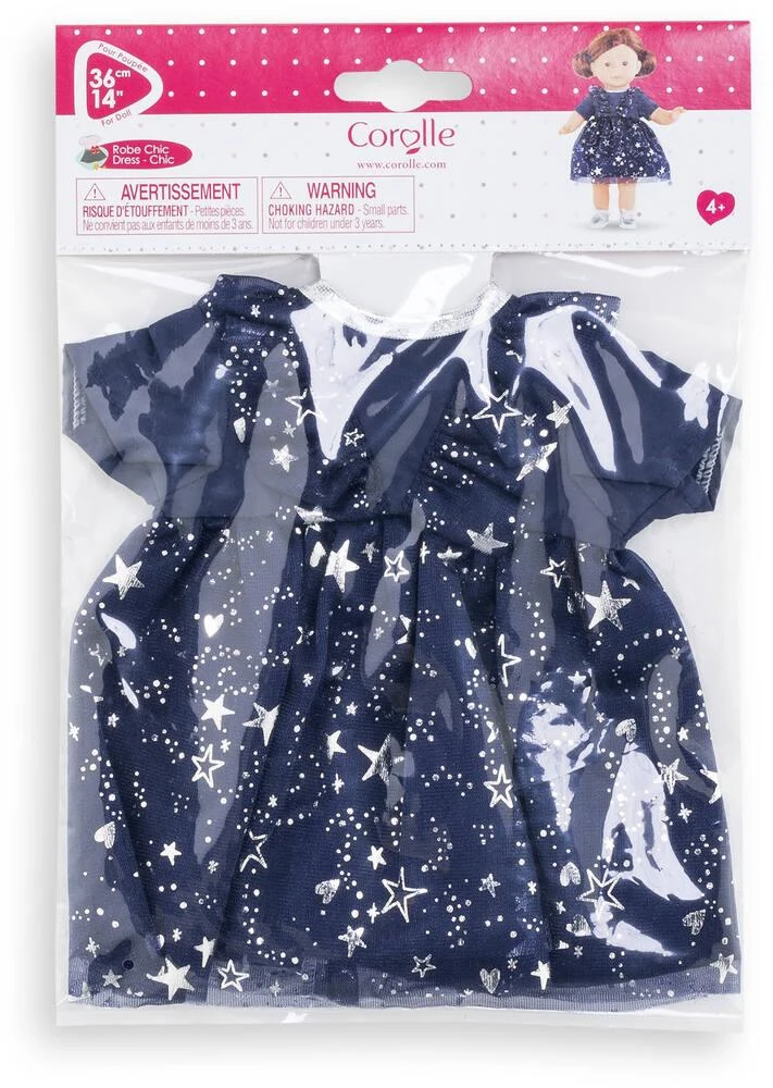 Avec cette robe à étoiles argentées; c’est un look chic assuré pour les soirées des poupées ma Corolle.