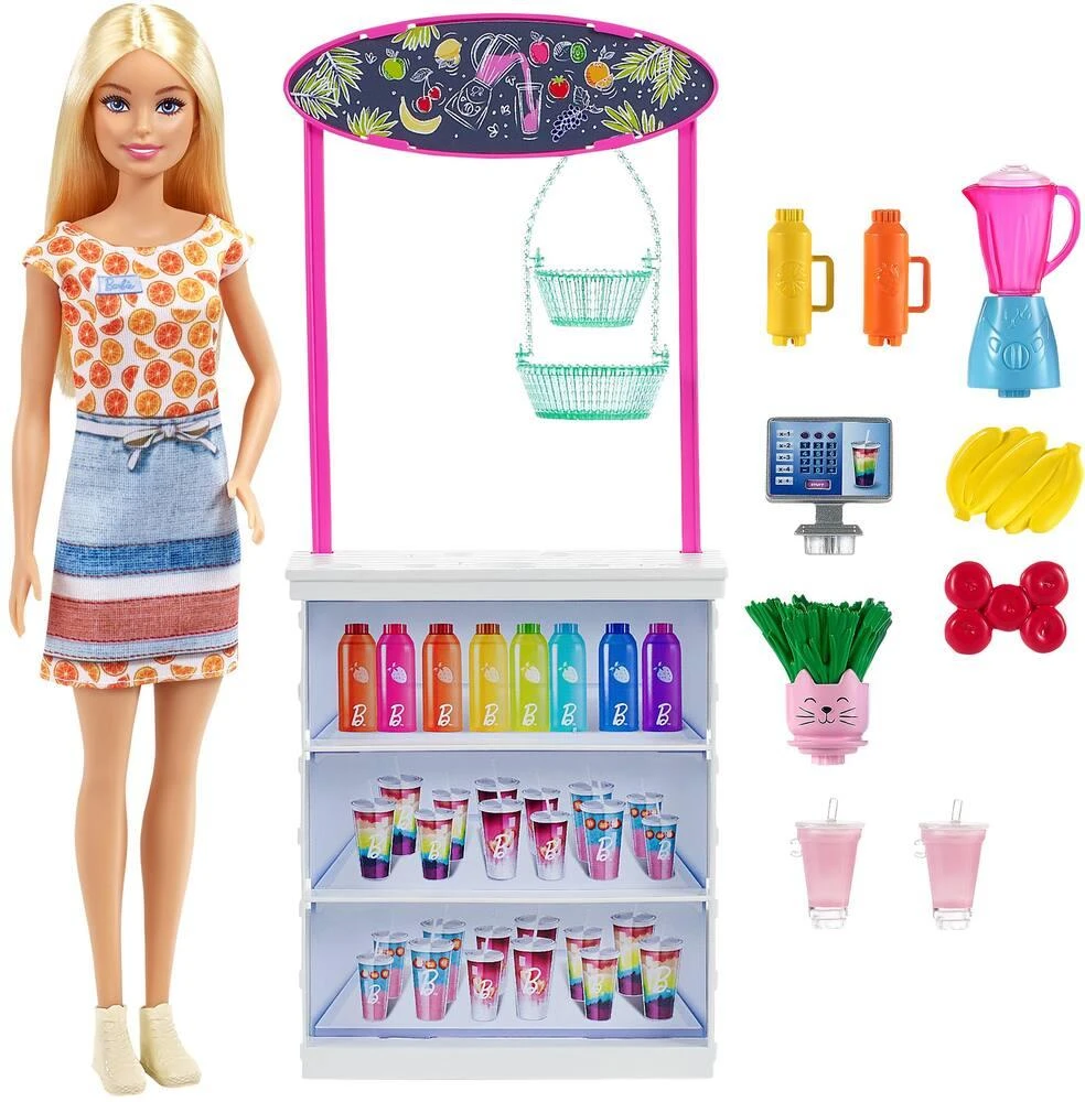 Avec ce coffret Barbie Bar à Smoothies, préparer et servir des boissons devient un jeu d’enfant ! La poupée Barbie dispose de tout le nécessaire pour préparer de succulents smoothies. Inclut une poupée Barbie, un stand de smoothies et 10 accessoires : 2 gobelets qui changent de couleur selon la température de l’eau qu’on y verse, avec couvercles amovibles, 2 gourdes, 2 ensembles de fruits, une corbeille à fruits, un blender, une caisse enregistreuse et un pot d’herbe de blé en forme de chat.