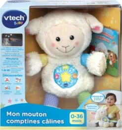 Mon mouton comptines câlines. Un mouton parlant et musical interactif ! Cette peluche veilleuse toute douce accompagne Bébé au moment du coucher et apaise ses nuits. 4 chansons et 4 comptines parlées que Bébé peut suivre avec ses parents grâce au petit livre de 4 pages inclus. Une étoile avec des variations lumineuses rassure Bébé. 50 mélodies et 4 chansons qui pourront être jouées jusqu’à 30 minutes en continu.Module électronique détachable pour laver le mouton (à la main).Réglage du volume sonore et arrêt automatique.